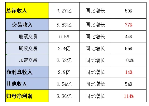 净收入同比增长50%,达到9.27亿美元。基于交易收入同比增长77%,达到5.83亿美元。其中,加密货币交易收入同比增长超过100%,期权交易收入同比增长56%,股票交易收入同比增长44%。归母净利润同比增长114%。