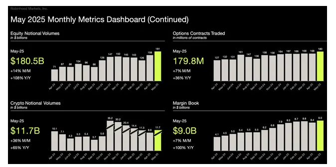 此外,HOOD每个月会发布平台交易数据,下图显示,5月份,平台股票交易量仍同比增长108%,期权同比增长36%,加密货币同比增长65%。